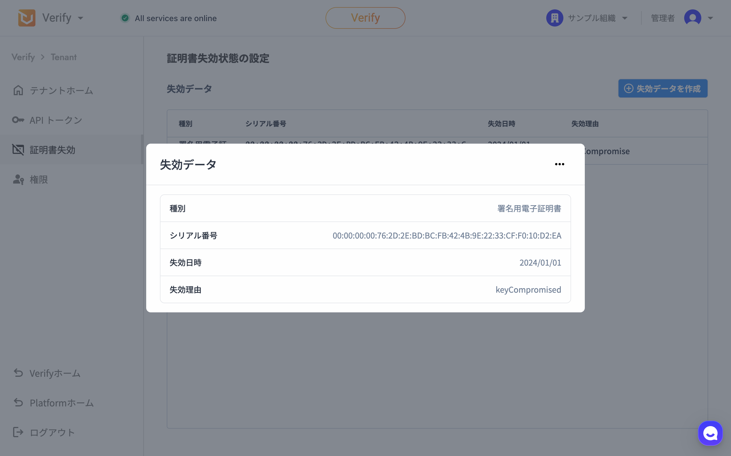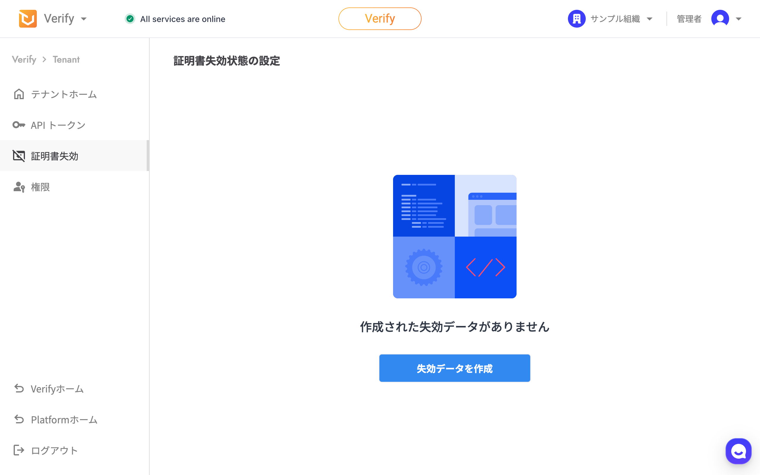 Verify テナントの画面に移動し、左側のメニューから「証明書失効」へ移動します。