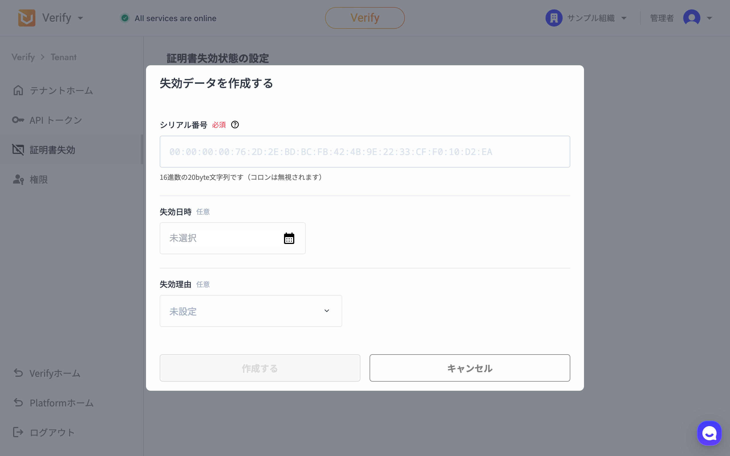 失効データの詳細を入力し、「作成」をクリックします。 失効理由については、証明書の失効事由をご参照ください。