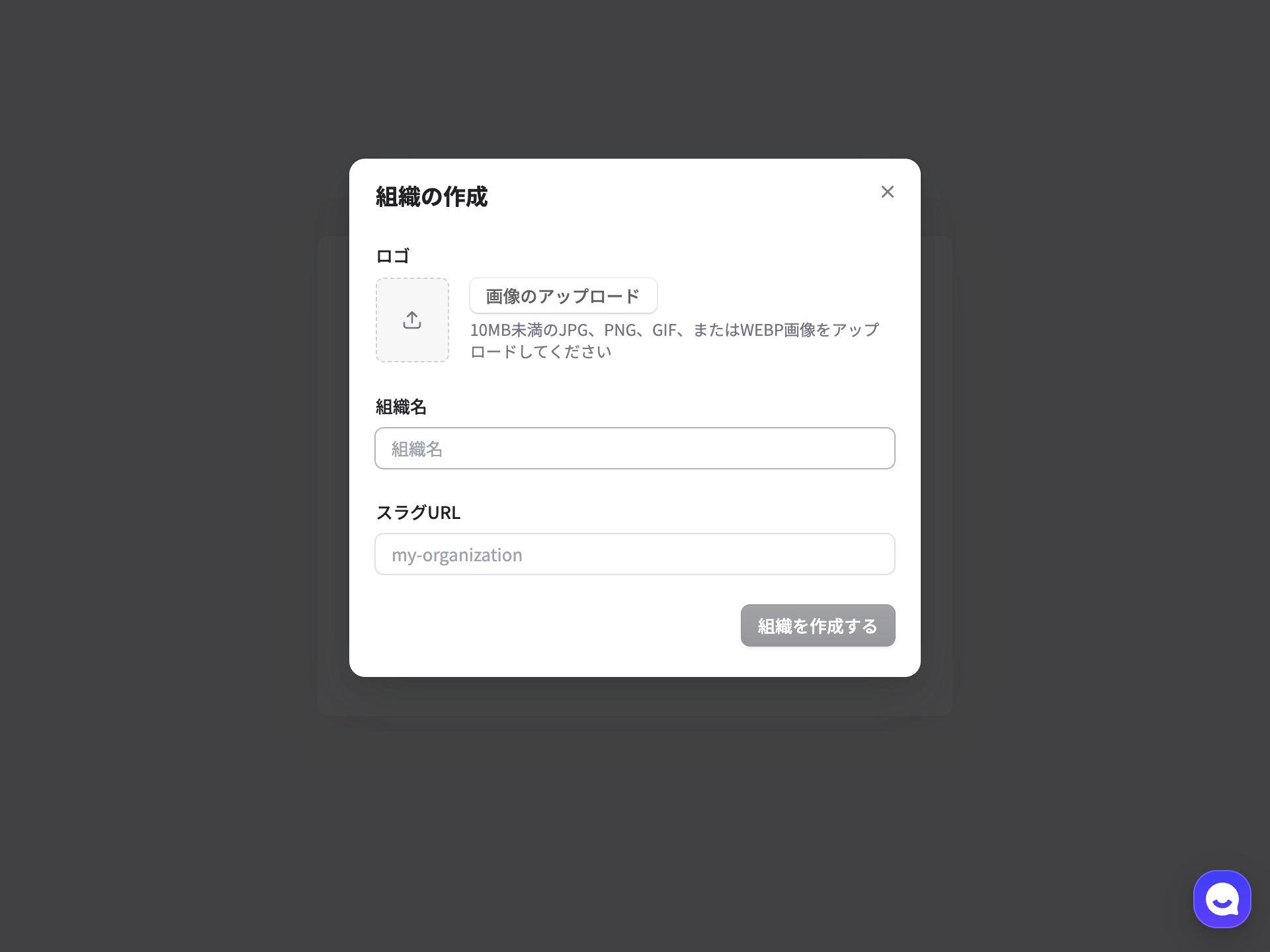 組織名と好きな slug を入力し、「組織を作成する」をクリックします。