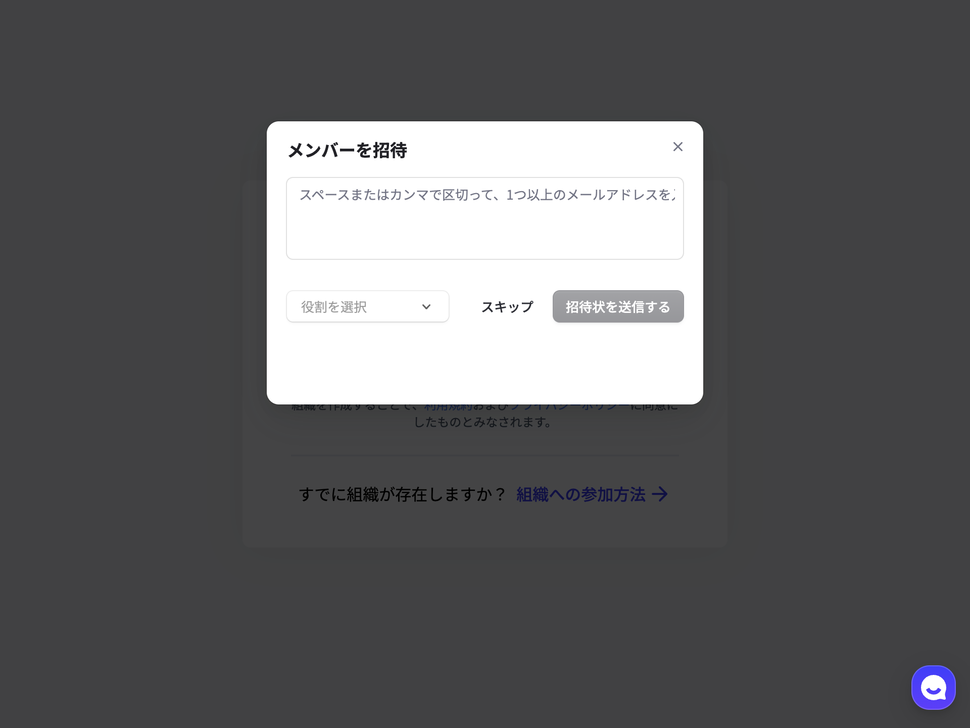 もしあなたが会社で最初の登録者であれば、「組織を作成する」をクリックしましょう。 既に同僚がアカウントを持っているなら、その組織に招待してもらいましょう。招待の方法はメンバーを組織に追加するをご参照ください。