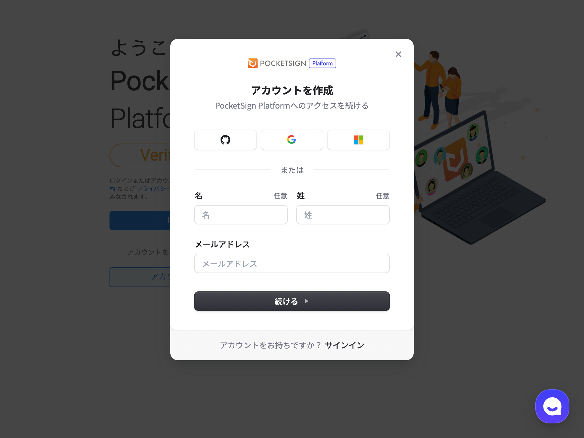 SSO に利用するアカウントを選択するか、必要な情報を入力し「続ける」をクリックします。