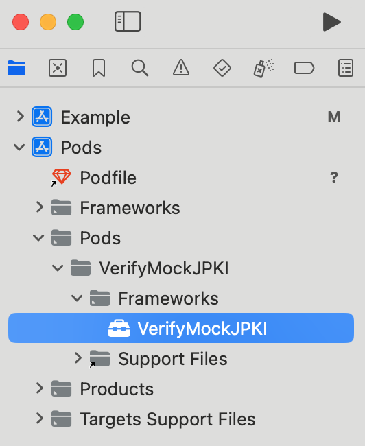 生成された .xcworkspace を開くと、VerifyMockJPKI が追加されたことを確認できます。