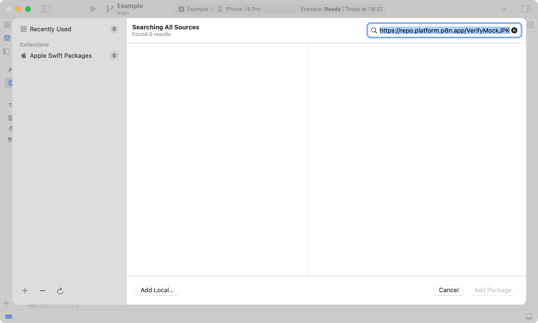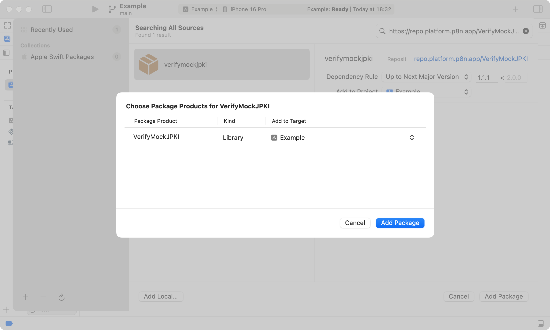 「Add To Target」でアプリターゲット(ここでは「Example」です)を選択し、「Add Package」をクリックします。