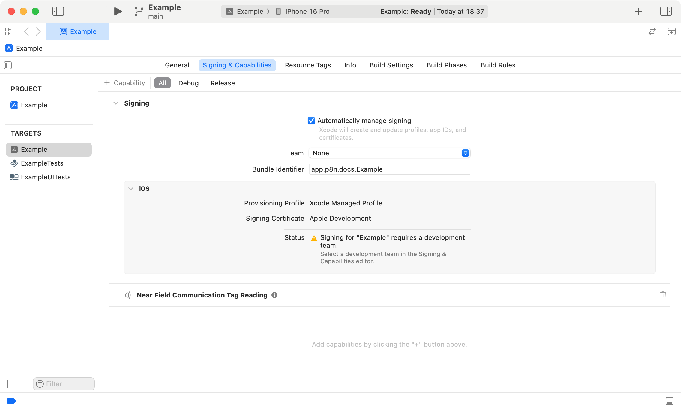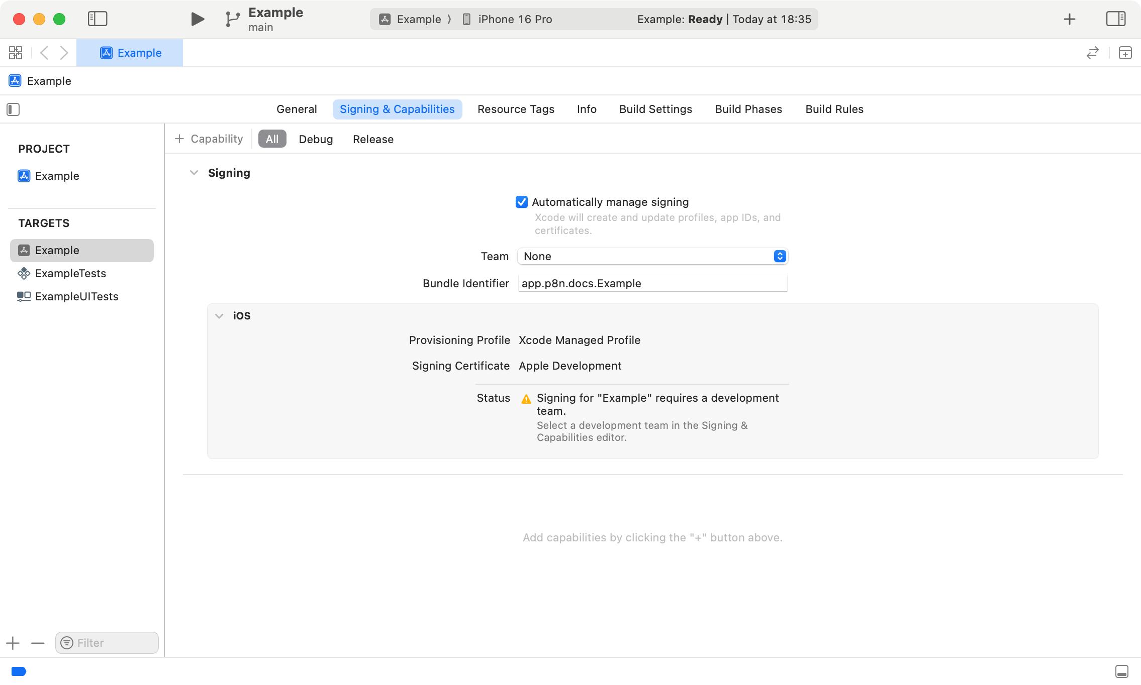 サイドバーの「TARGETS」の下にあるアプリターゲット名(ここでは「Example」です)を選択し、上部のタブから「Signing & Capabilities」を選択します。 Team の部分をクリックし、Apple Developer Program に登録した Team を選択します。選択後、証明書がプロビジョニングされて下の「iOS」セクションのエラーが消えることを確認します。