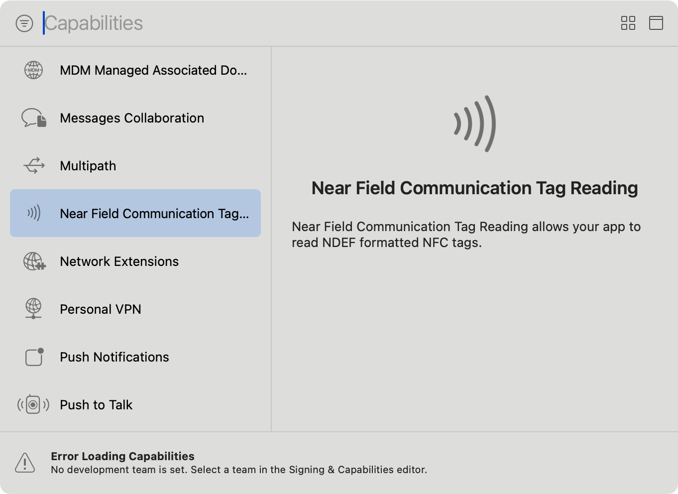 同じ画面で、右上の「+ Capability」をクリックし、「Near Field Communication Tag Reading」を選択します。