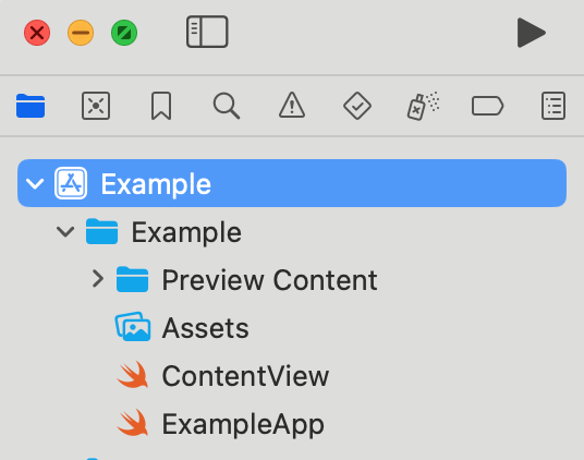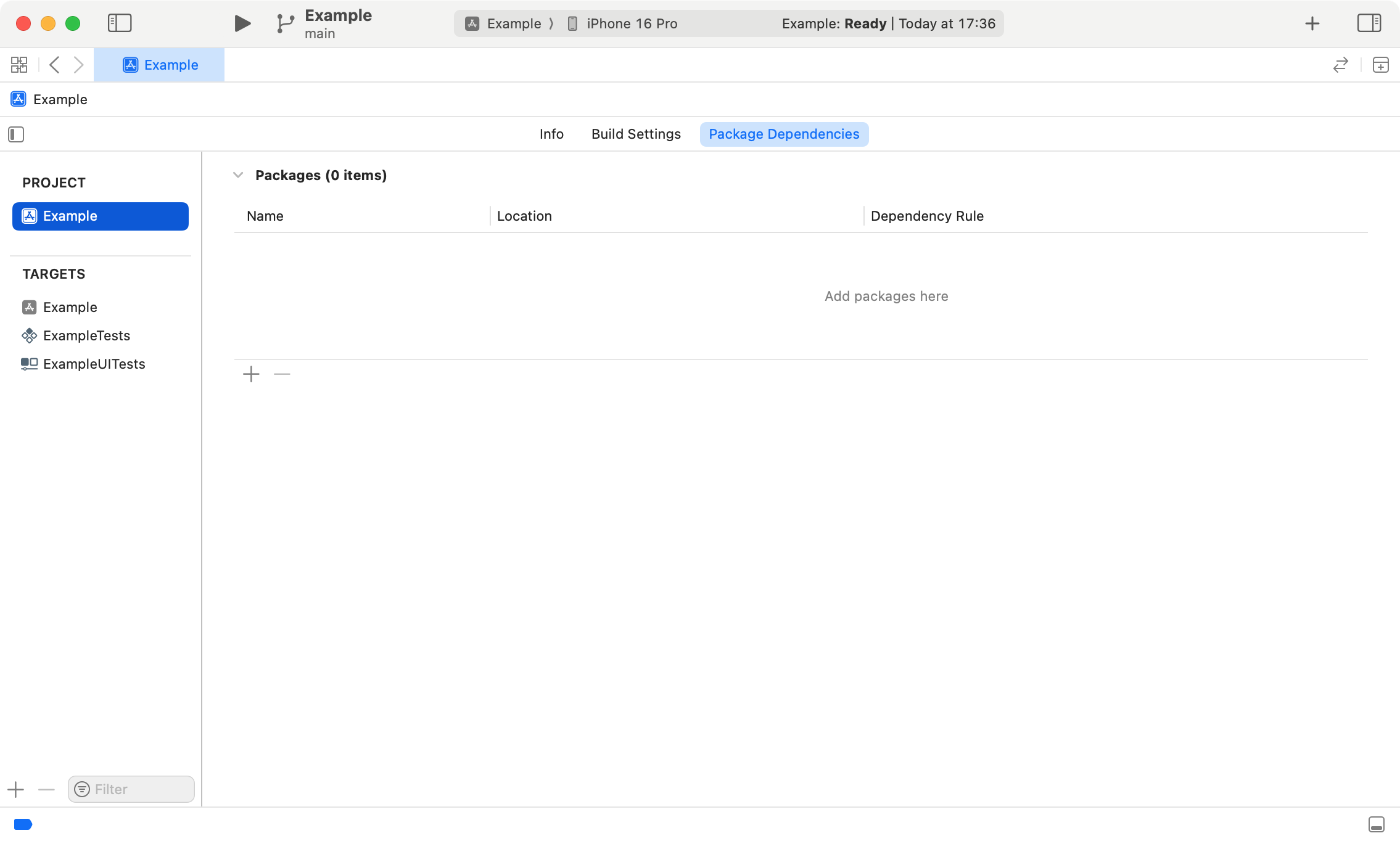 サイドバーの「PROJECT」の下にあるプロジェクト名(ここでは「Example」です)を選択し、上部のタブから「Package Dependencies」を選択し、「Packages」テーブルの下にある「+」をクリックします。