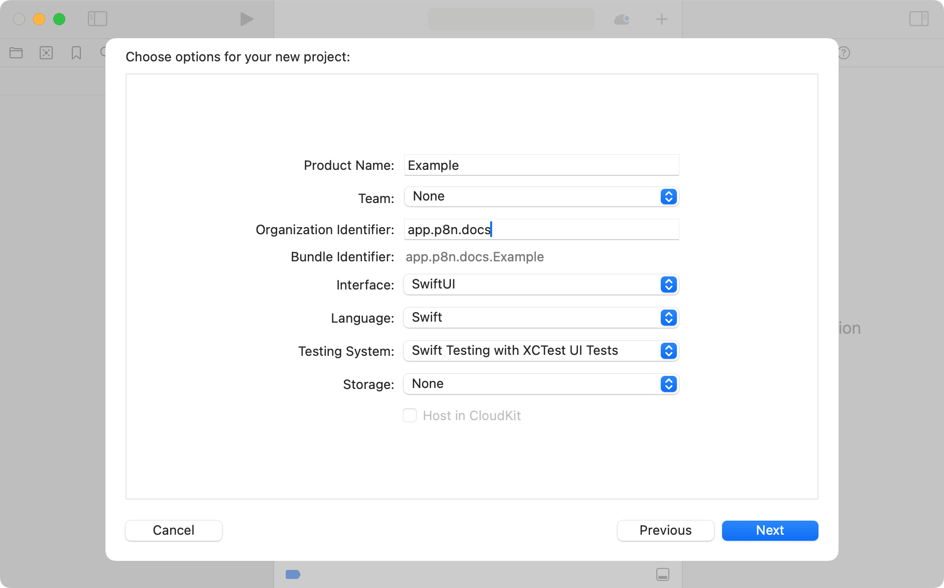 プロジェクトの詳細情報を設定します。この資料では、SwiftUI を使用してサンプルアプリを作成します。