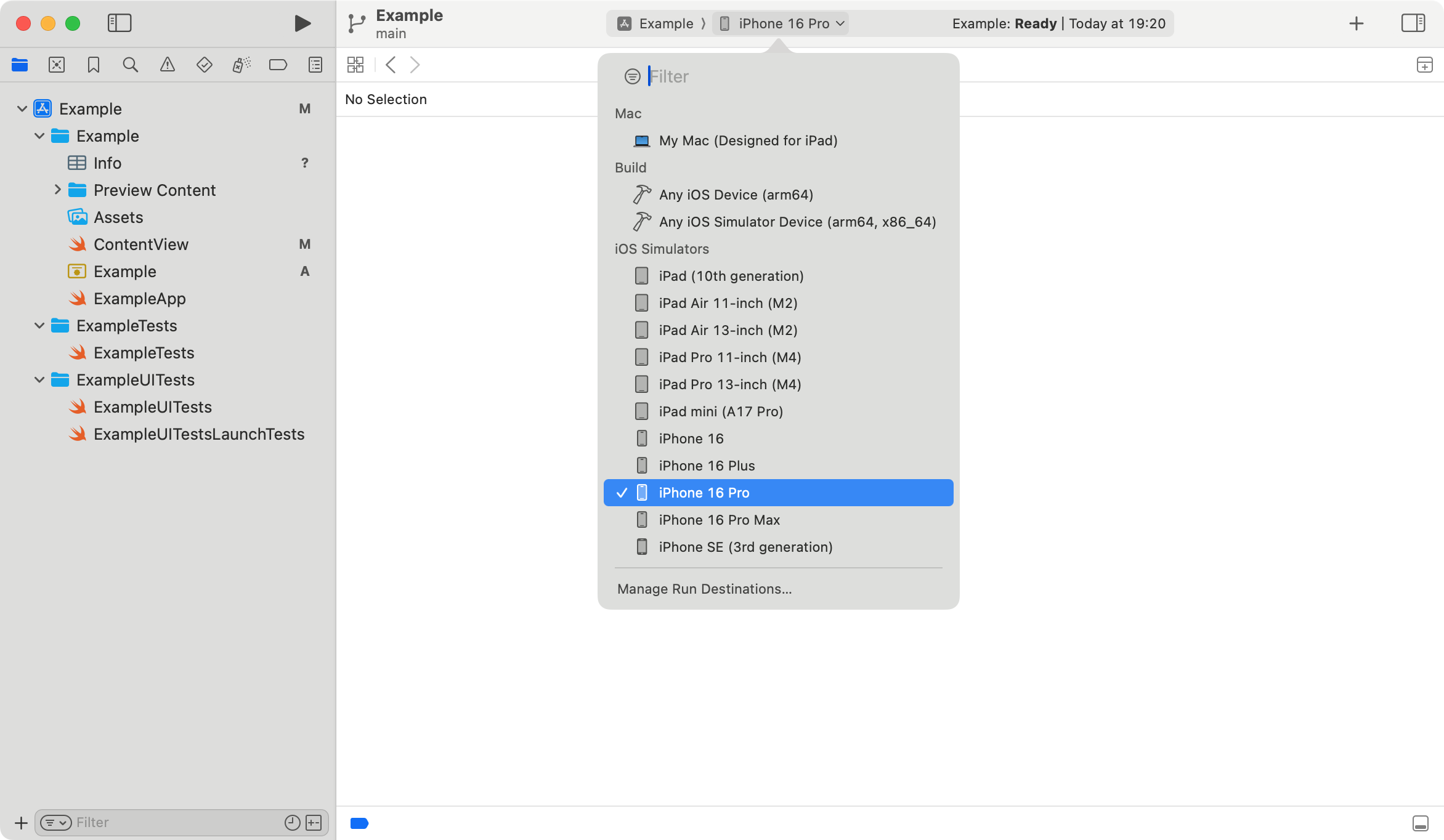 Xcode のツールバーから、任意の iPhone シミュレータを選択し、ターゲットに設定します。
